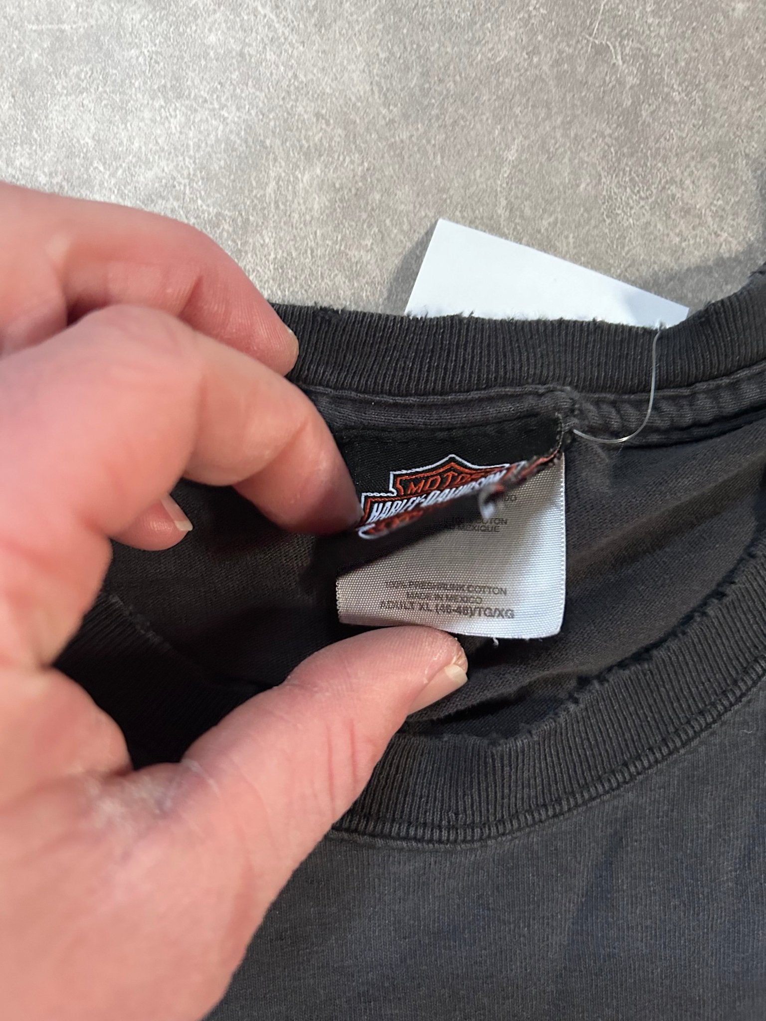 This authentic early 2000s Harley Davidson tee captures the worn-in character of genuine vintage wear. The faded black fabric shows natural aging and distressing, while visible repairs tell the story of a well-loved piece. Cut in a classic XL fit, it's ideal for collectors seeking authentic motorcycle memorabilia or anyone drawn to vintage band and brand tees with real history. A standout addition to any vintage wardrobe.