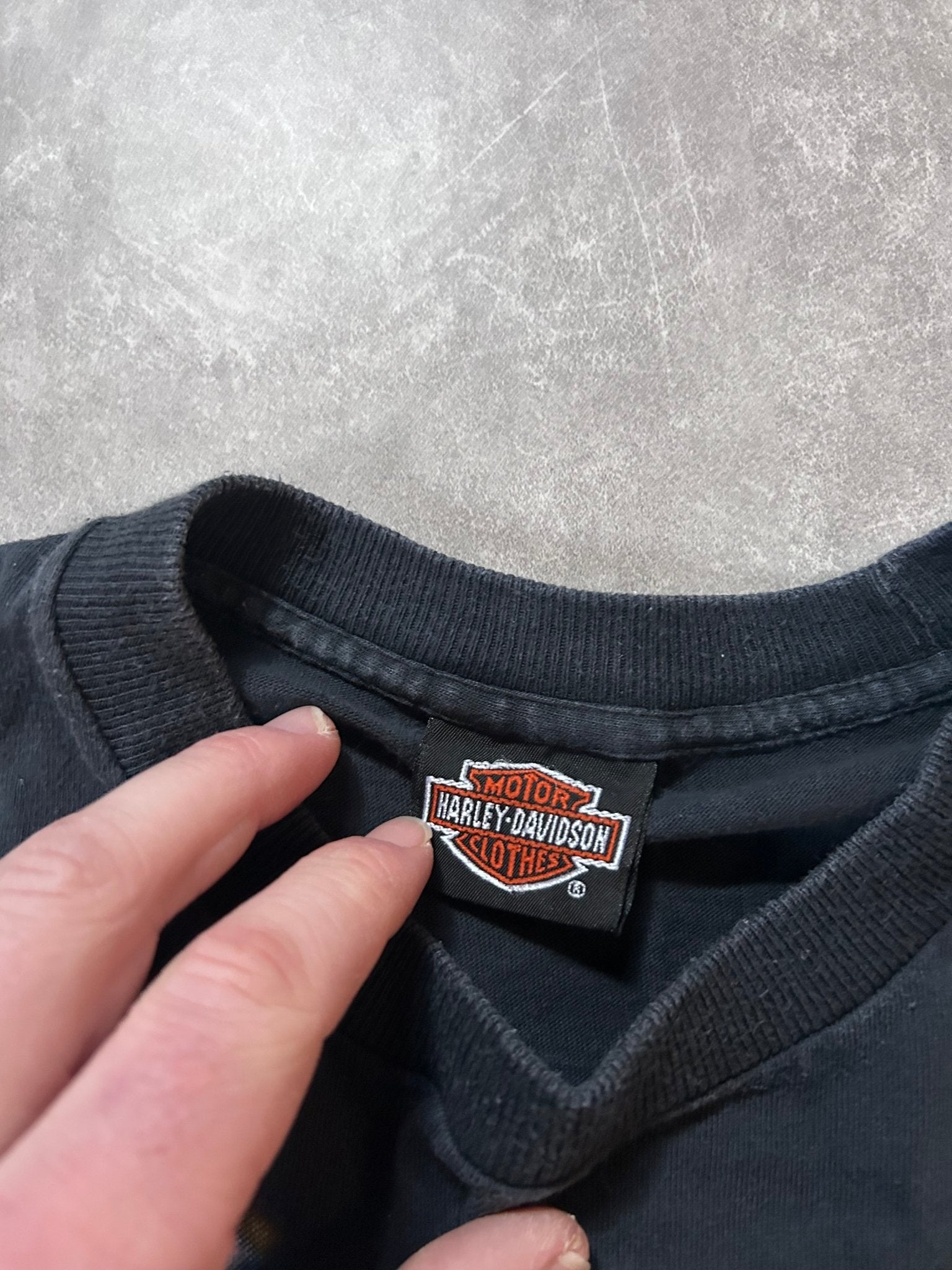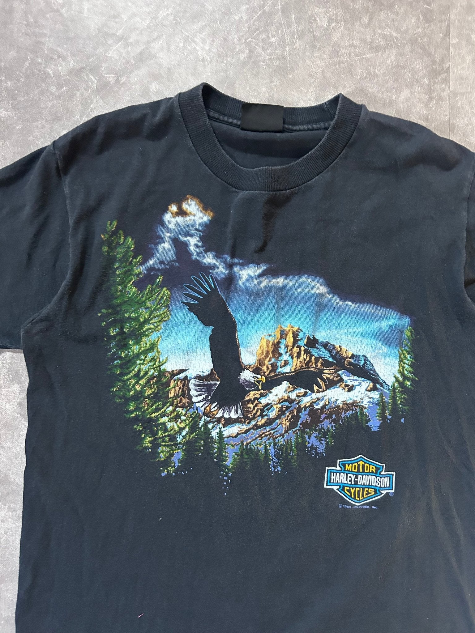 Authentic 90s Harley Davidson graphic tee featuring a bold flying eagle design across the chest. This size medium showcases the signature faded black finish characteristic of vintage pieces from that era, with soft, broken-in fabric that speaks to genuine age and wear. The classic motorcycle imagery and distressed aesthetic make it a standout addition to any vintage collection. Perfect for enthusiasts seeking authentic 90s Americana style.